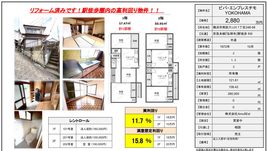 物件メニュー 【NEW!】ランドヒルズ横浜 横浜市南区堀ノ内町2-239-7 【NEW!】サンヨーハイツ 横浜市港北区菊名5-3-27 【NEW!】リシェス立野台 神奈川県座間市立野台2-16-27 【NEW!】セレーノプリモⅠ 東京都町田市相原町1237-5 【築浅!】横浜市戸塚区倉田町アパート 神奈川県横浜市戸塚区倉田町 【NEW!】ラフィーネ磯子 神奈川県横浜市磯子区森2丁目10-12 【NEW!】磯子JSハイツ 横浜市磯子区久木町22-11 【売地】保土ヶ谷区鎌谷町 横浜市保土ヶ谷区鎌谷町41-3 【売地】町田市野津田町 東京都町田市野津田町2766-3 【NEW!】エルム南林間 大和市南林間5丁目8-29 【NEW!】ビバ・エンプレスチモYOKOHAMA 横浜市南区六ッ川1丁目248-58 【NEW!】レオパレスISO 横浜市磯子区岡村3-7-4 【NEW!】藤ハイツ 横浜市港北区菊名5-9-17 【NEW!】グロリアス戸塚 横浜市戸塚区汲沢6丁目37-8 【新発売】鵠沼藤ヶ谷 藤沢市鵠沼藤ヶ谷 日吉本町3区画 横浜市港北区日吉本町5丁目 荏田町3区画 横浜市青葉区荏田町 日吉本町5丁目AP 横浜市港北区日吉本町5丁目 Philippine Davao 新築マンション販売<手数料不要> オーシャンビュー最上階23F、22F Philippine Davao 土地販売情報<手数料不要> narrapark区画整理地内 SALE販売事例物件の本当の価値を説明するのが当社の特長です。 ホーム > 【NEW!】ビバ・エンプレスチモYOKOHAMA SALE18 【NEW!】ビバ・エンプレスチモYOKOHAMA 横浜市南区六ッ川1丁目248-58 高利回りで投資にオススメです! 弘明寺駅チカ!徒歩8分