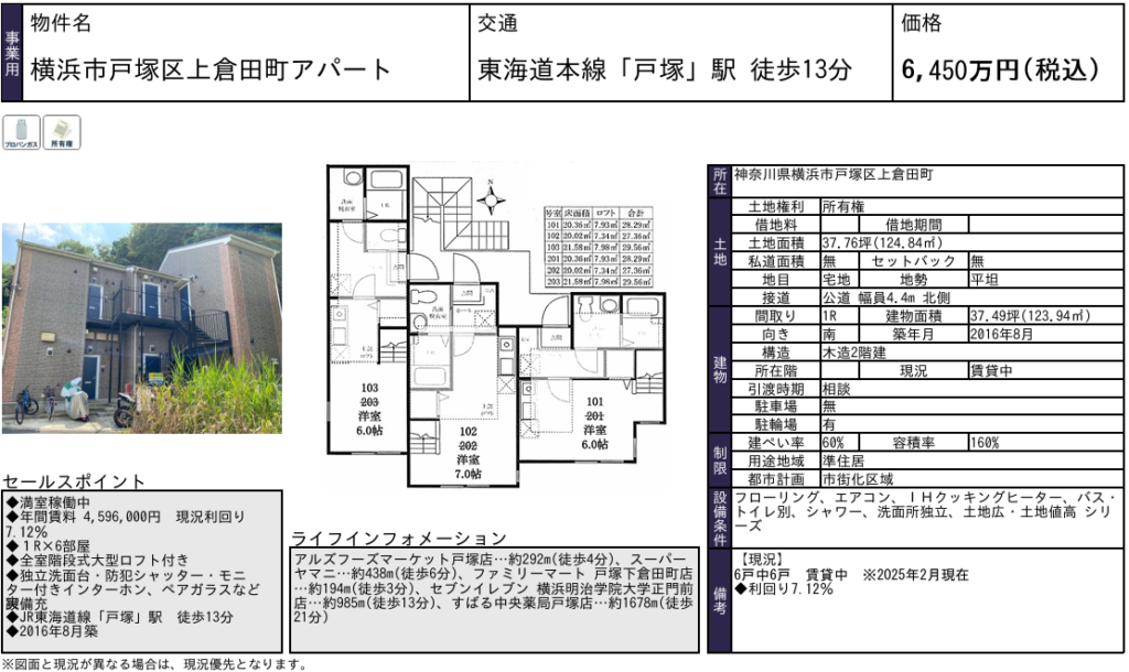 物件メニュー 【NEW!】ランドヒルズ横浜 横浜市南区堀ノ内町2-239-7 【NEW!】サンヨーハイツ 横浜市港北区菊名5-3-27 【NEW!】リシェス立野台 神奈川県座間市立野台2-16-27 【NEW!】セレーノプリモⅠ 東京都町田市相原町1237-5 【NEW!】横浜市戸塚区倉田町アパート 神奈川県横浜市戸塚区倉田町 【NEW!】ラフィーネ磯子 神奈川県横浜市磯子区森2丁目10-12 【NEW!】磯子JSハイツ 横浜市磯子区久木町22-11 【売地】保土ヶ谷区鎌谷町 横浜市保土ヶ谷区鎌谷町41-3 【売地】町田市野津田町 東京都町田市野津田町2766-3 【新発売】鵠沼藤ヶ谷 藤沢市鵠沼藤ヶ谷 『青葉区桂台』 横浜市青葉区桂台 旧東急電鉄分譲地 建築条件なし 【販売予告】『野津田5区画分譲地』 東京都町田市野津田町 日吉本町3区画 横浜市港北区日吉本町5丁目 荏田町3区画 横浜市青葉区荏田町 日吉本町5丁目AP 横浜市港北区日吉本町5丁目 【NEW】 すみれが丘 中古戸建 6,780万円 3SLDK 横浜市都筑区すみれが丘33-19 Philippine Davao 新築マンション販売<手数料不要> オーシャンビュー最上階23F、22F Philippine Davao 土地販売情報<手数料不要> narrapark区画整理地内 SALE販売事例物件の本当の価値を説明するのが当社の特長です。 ホーム > 【NEW!】横浜市戸塚区倉田町アパート SALE16 【NEW!】横浜市戸塚区倉田町アパート 神奈川県横浜市戸塚区倉田町